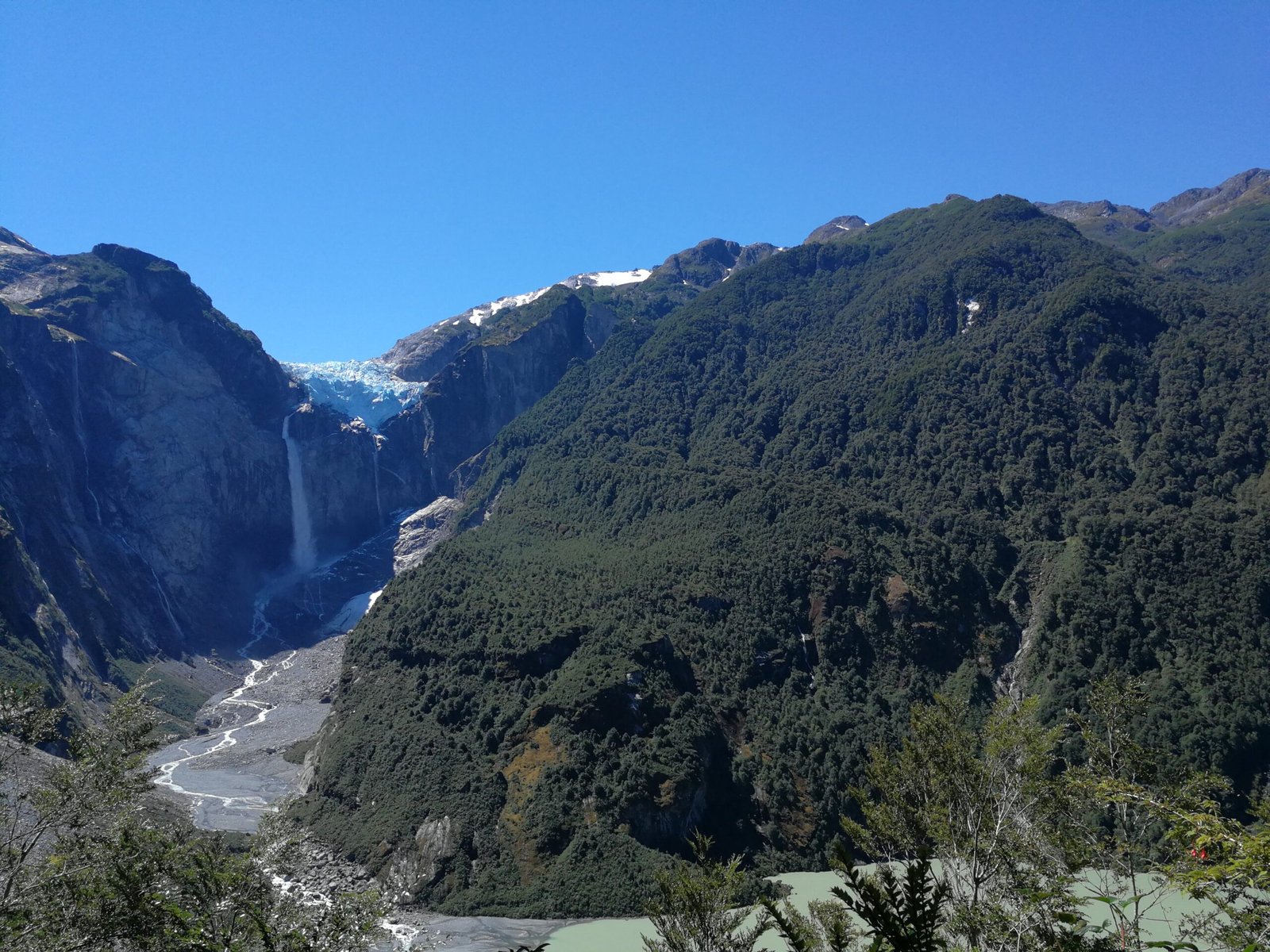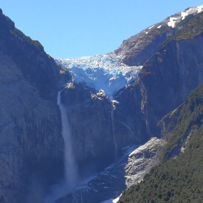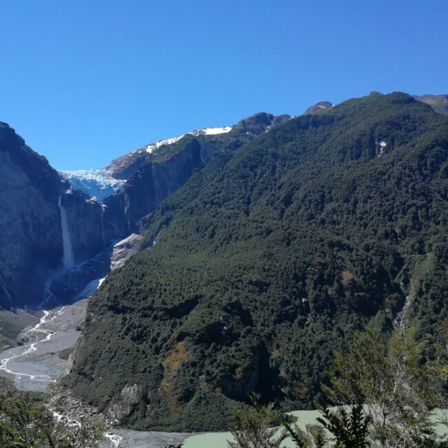 Entre bosques siempre verdes y montañas cubiertas de niebla aparece uno de los grandes símbolos de la región: el Ventisquero Colgante, un glaciar suspendido entre montañas desde donde caen cascadas hacia el valle.