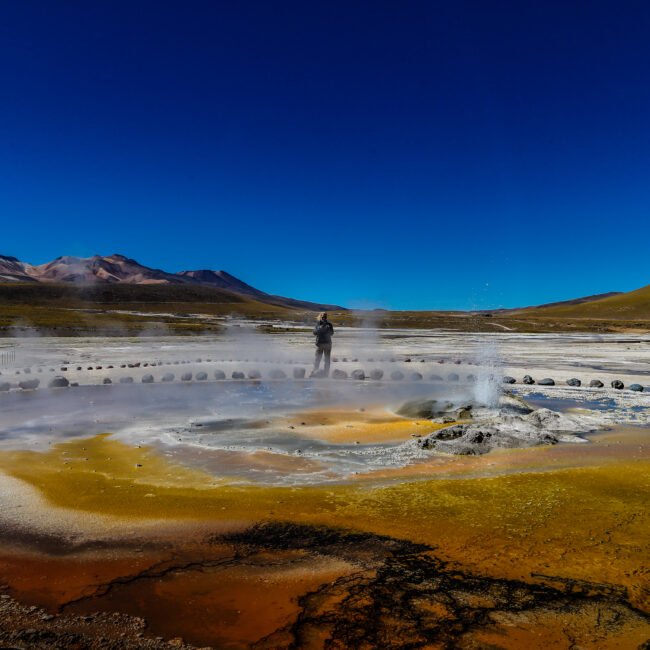 • Salida muy temprano hacia el Géyser del Tatio, cuyo nombre en lengua kunza significa “el abuelo que llora”, uno de los campos geotermales más altos del mundo. Al amanecer disfrutaremos del espectáculo de sus fumarolas mientras desayunamos en el altiplano andino.